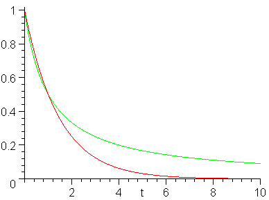 c) Neben dem exponentiellen Abklingen einer Schwingung kommt auch ein Abklingen vor, das umgekehrt proportional zur Zeit ist. Man kann die Typen des Abklingens so vergleichen: