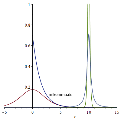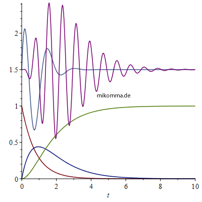 | Instabile Tochterelemente erreichen nie die volle "Besetzungszahl". Unstable daughter elements never reach the full "occupation number". Erst durch Hinzufügen des "Grundzustands" (hier nicht dargestellt) wird die Summe aller Kurven 1. Übertragen auf den "Zerfall eines Atoms" bedeutet das, dass sich das Elektron auf seinem Weg in den Grundzustand nie vollständig in einem der Zwischenzustände befindet. Only by adding the "ground state" (not shown here) is the sum of all curves 1. Transferring to the "decay of an atom" means that the electron is never completely in one of the intermediate states on its way to the ground state. Übrigens würde das bedeuten, dass ein Atom auf seinem Weg zum Grundzustand (der sicher eine endliche Zeit dauert) alle "erlaubten Frequenzen" mehr oder weniger gleichzeitig abstrahlt (siehe Photokaskade ). By the way, this would mean that an atom on its way to the ground state (which certainly takes a finite time) radiates all "allowed frequencies" more or less simultaneously (see photo cascade ). Das kann durchaus richtig sein, widerspricht aber der Annahme "zur Zeit t = 0 " (oder wann auch immer) "springt das Atom" oder findet der "Emissionsakt" statt. This may well be correct, but contradicts the assumption "at time t = 0 " (or whatever) "the atom jumps" or takes place the "emission act". | Hier ist nun die Besetzung des Grundzustands mit eingezeichnet (grün). Here is the occupation of the ground state with marked (green). Für die "Amplitude der Photonen" wurde als Einhüllende das Produkt der Besetzungszahlen (das zeitabhängige Dipolmoment, siehe ) genommen. For the "amplitude of the photons", the product of the occupation numbers (the time-dependent dipole moment, see ) was taken as an envelope. Die kleine Frequenz gehört zum ersten Übergang und die größere Frequenz zum zweiten. The small frequency belongs to the first transition and the higher frequency belongs to the second. Folgt man der Argumentation von WeWi und Kikuchi, so müsste die Emission beider Photonen schlagartig "zur Zeit 0" beginnen. If one follows the argument of WeWi and Kikuchi, then the emission of both photons would have to start abruptly "at time 0". Man liest aber bei WeWi (zB S.58): But one reads at WeWi (eg p.58): "...und die Wahrscheinlichkeit, dass ein Atom, das vor langer Zeit im Zustand A war, nacheinander drei Lichtquanten mit den Frequenzen ... emittiert" . "... and the probability that an atom that was in state A a long time ago will successively emit three light quanta with the frequencies ..." . |