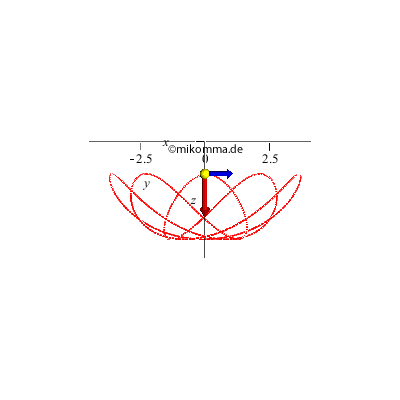 Wenn man die Anfangsbedingungen geeignet wählt, ergibt sich eine geschlossene Bahn (wie oben), die je nach Blickrichtung unterschiedlich aussieht. Von oben (der Faden ist wirklich immer gleich lang):